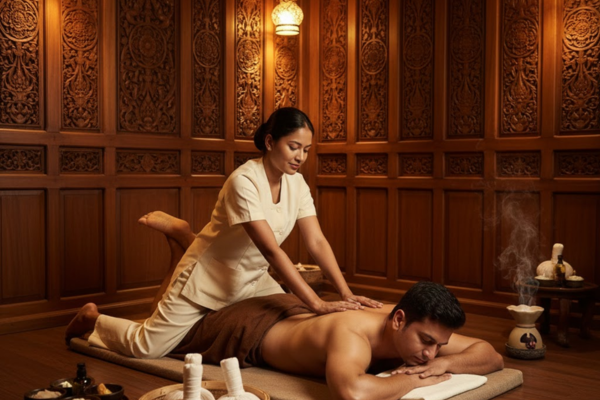 Traditional Thai massage using acupressure and natural oils to relieve muscle tension and improve circulation.