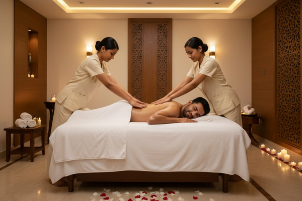 A luxury therapy where two therapists work in synchronized movements for ultimate relaxation.